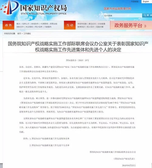 表彰链接原文:http://www.sipo.gov.cn/gztz/1125673.htm